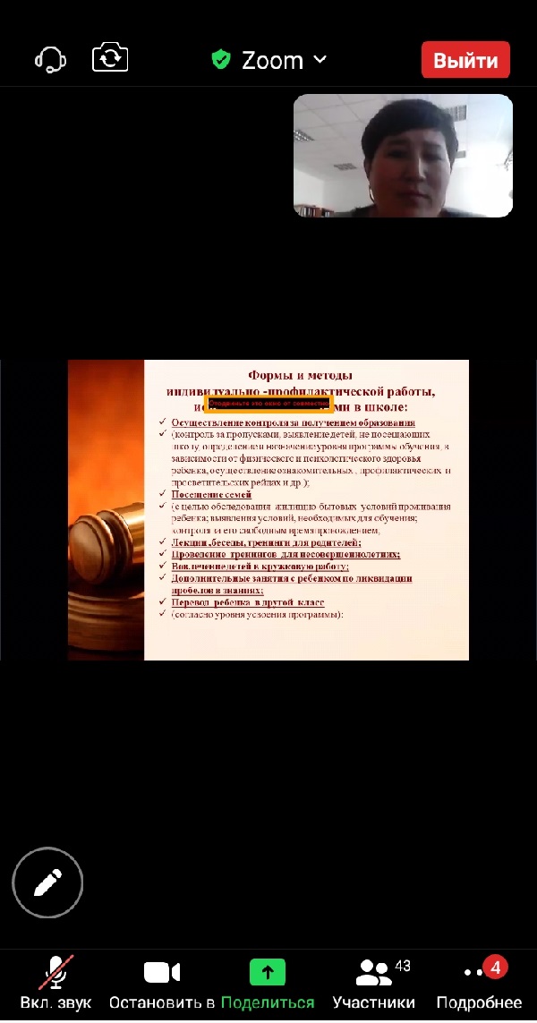 Қостанай облысы әкімдігі білім басқармасының «Меңдіқара ауданы білім бөлімінің Жангелдин жалпы білім беретін мектебі» КММ кәмелетке толмағандар арасындағы құқық бұзушылықты алдын алу бойынша өз тәжірибесін көрсетіп, семинарға қатысушылармен озық тәжірибелерімен бөлісті.